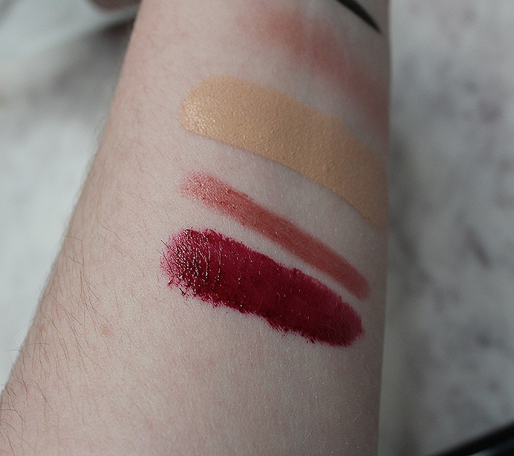 Here are the swatches of the swatchable items from the kit. Top to bottom: clay liner, exposed blush, gel hybrid foundation (look how dark!) and the liptint.
